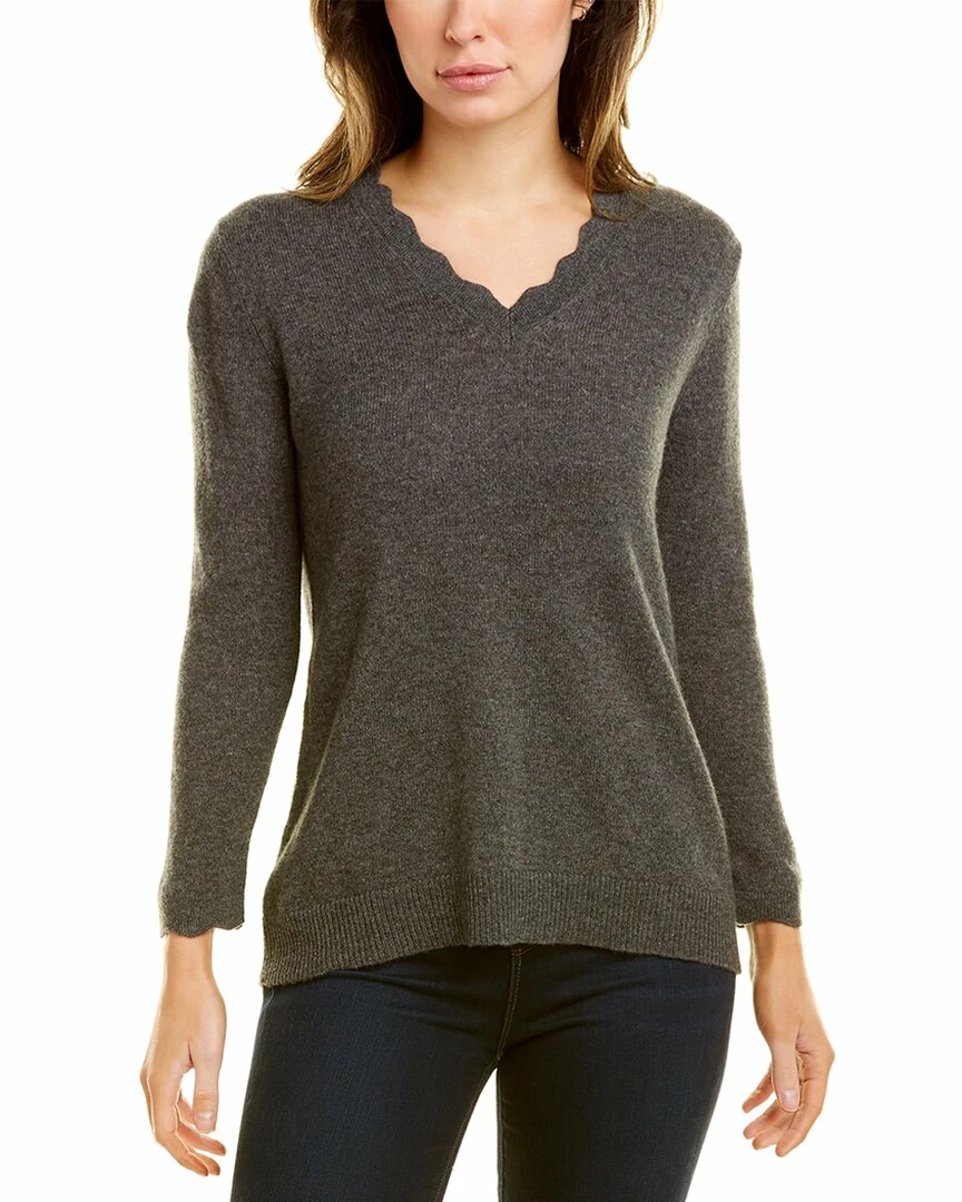 - Alaina Cashmere Pullover In Graphite With V-Neck And Scalloped Trim